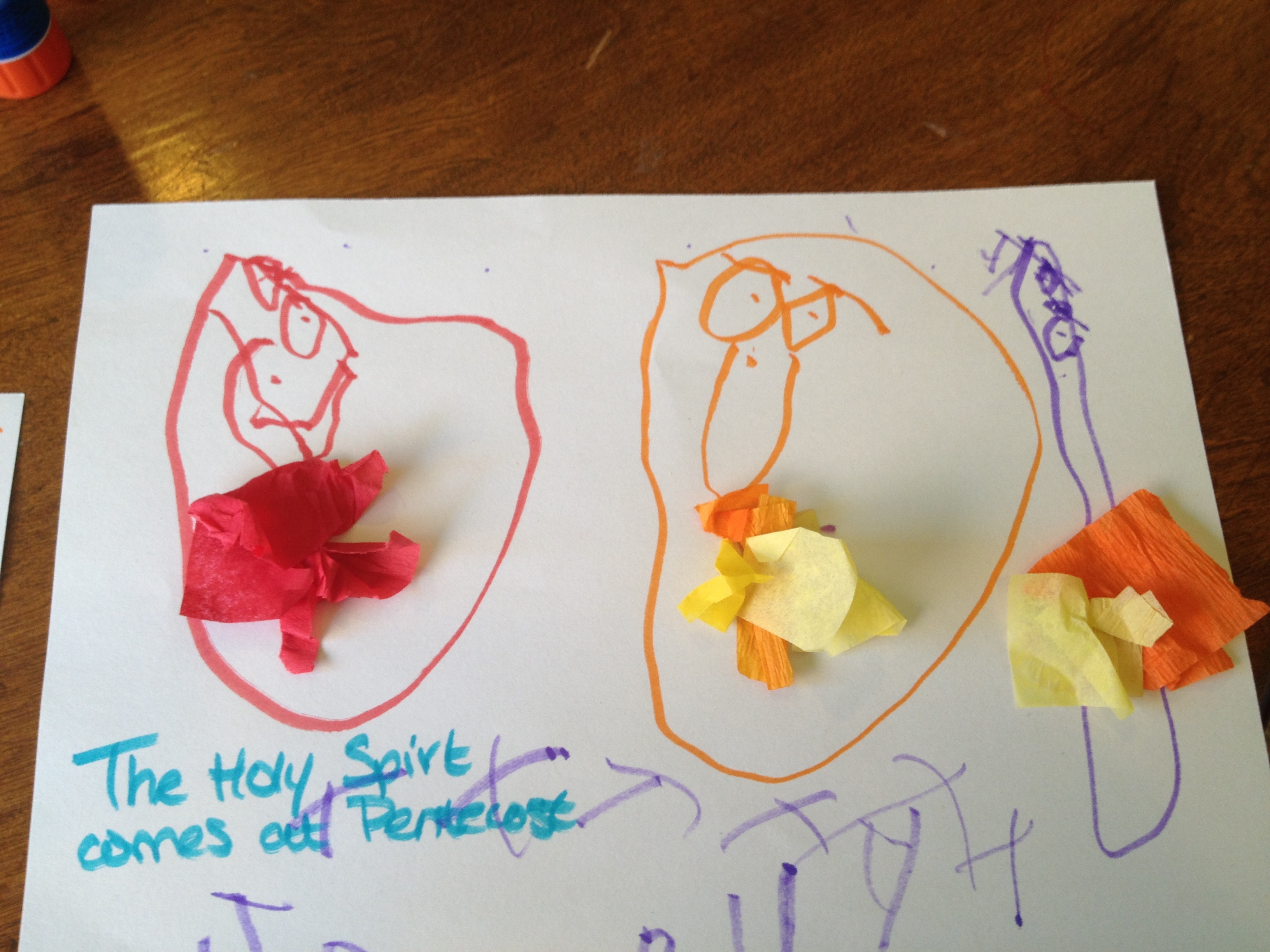 For our activity, we drew some of the disciples and then added tongues of fire (tissue paper). We talked about how when the Holy Spirit comes to live in our hearts, we probably won’t see real fire, but we will be given the same power that helped the disciples know how to talk to all the people. We might not be gifted to speak in different languages, but that power of God is in us (if we believe and repent) and He will help us do what we need to do to tell others about Him.