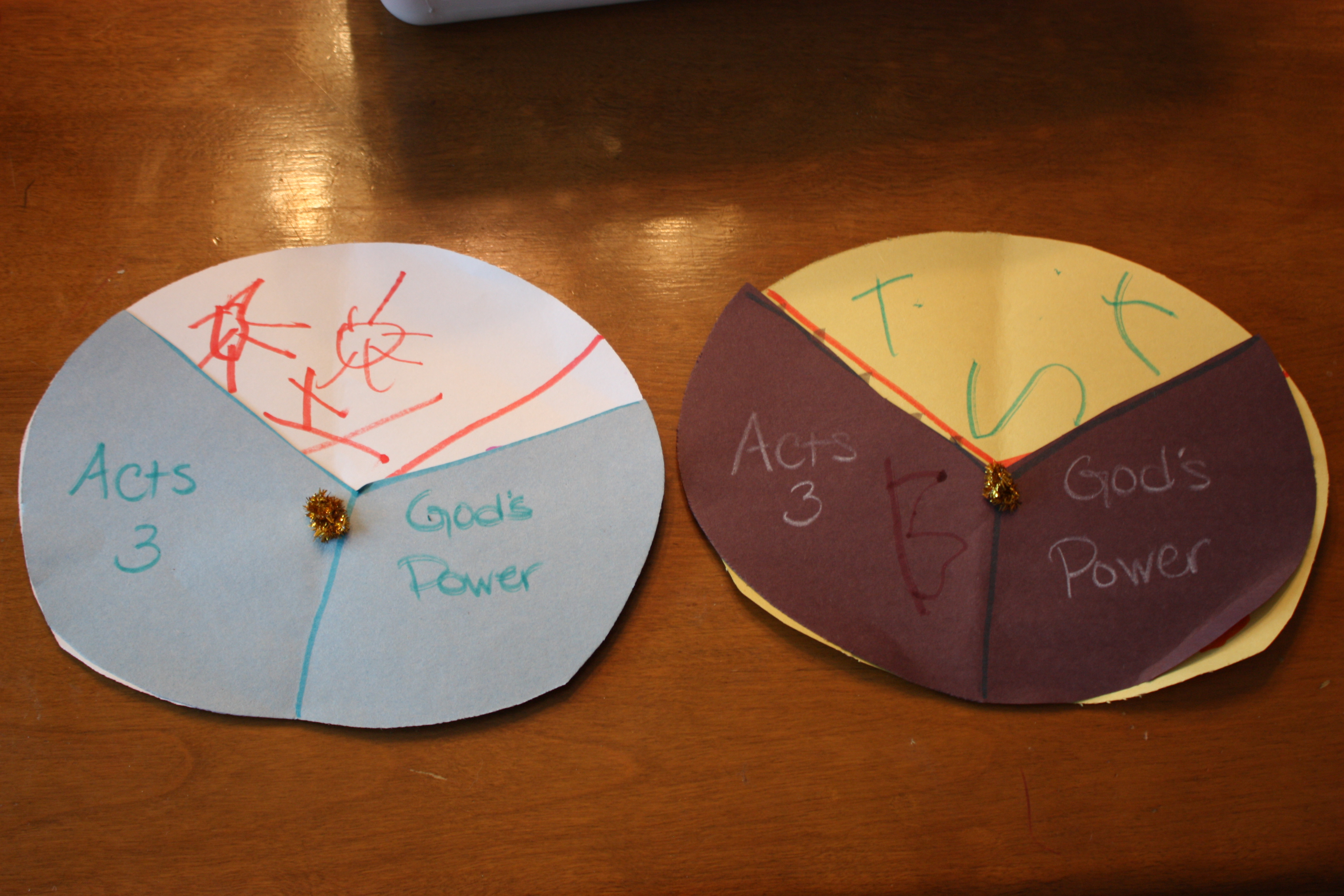 For our craft, we made a 3 piece window wheel. In the 1st section, we drew the man with ouchy legs. In the 2nd part, we drew the disciples boldly telling the people about Jesus. In the 3rd part, we drew the disciples in jail. Then we turned the wheels around to tell the story about the 3 times God helped the disciples know how to help and tell other about Jesus.