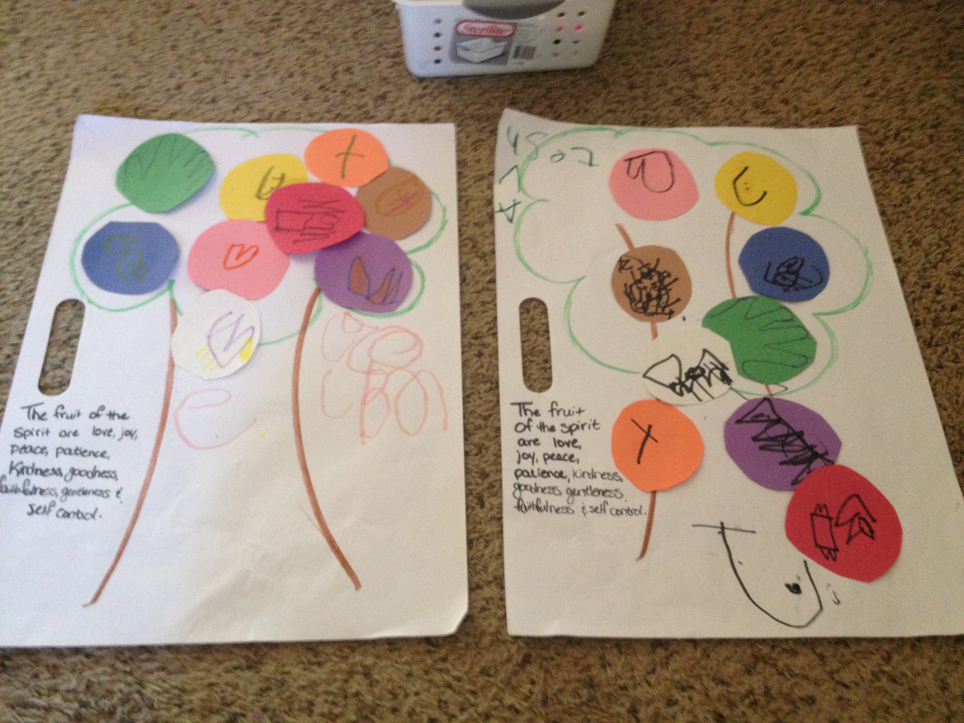 (We did our craft AS we covered each item) I drew a tree on each child’s paper and cut out the circles as i talked with them. Then they drew the illustration on each circle. (Bear in mind, my kids are 3…so some of these drawings may look a bit rudimentary. You could draw the outline and have your child color it in, or you could find some clip art if you wanted a more polished look.)