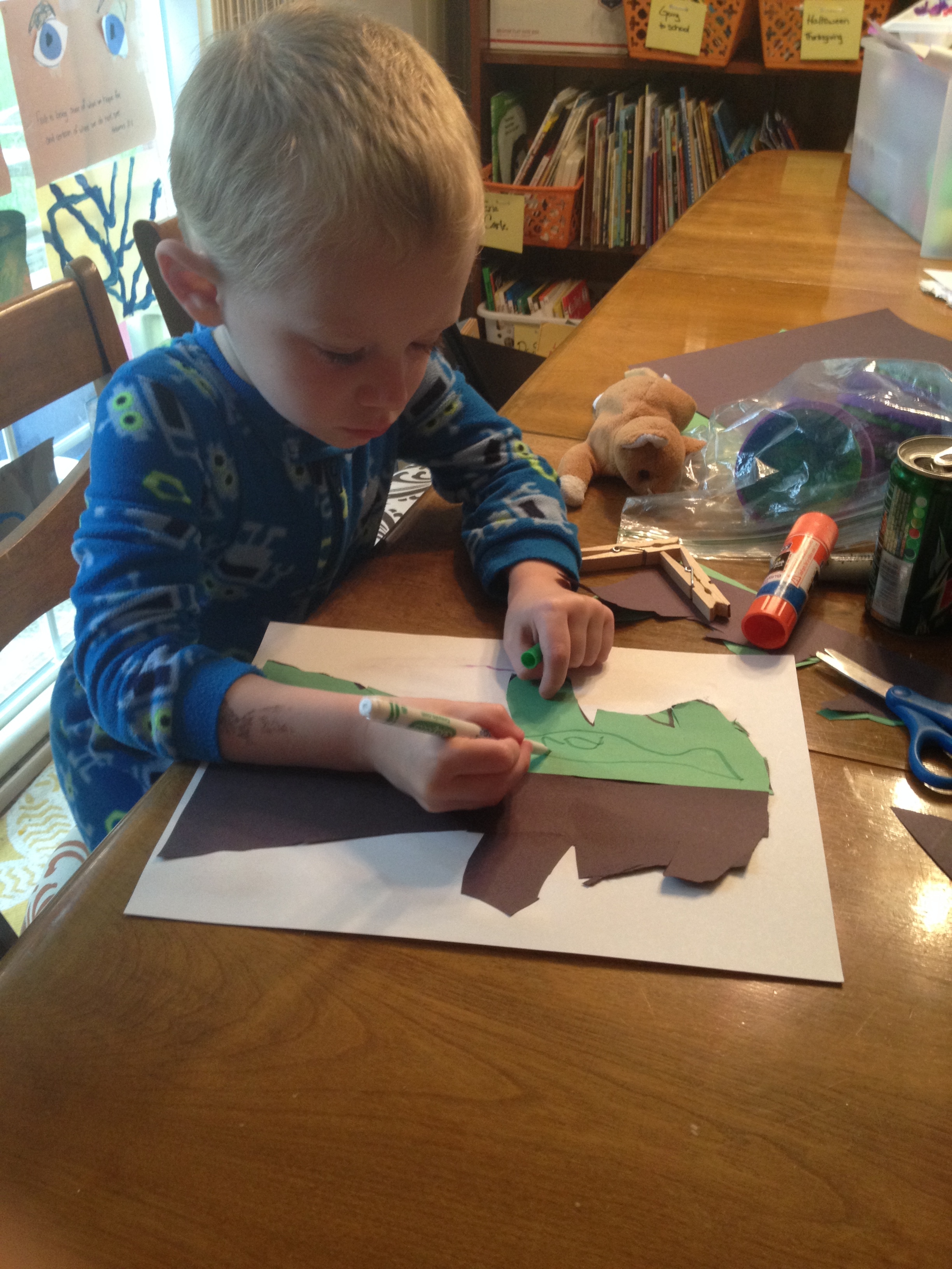 We also made a craft. We started by cutting a green and a black piece of paper each in half. Then i clipped them together and traced a tree on the green one. Then the kids cut out the tree on both pieces of colored paper and we glued each to a piece of white paper, side by side.