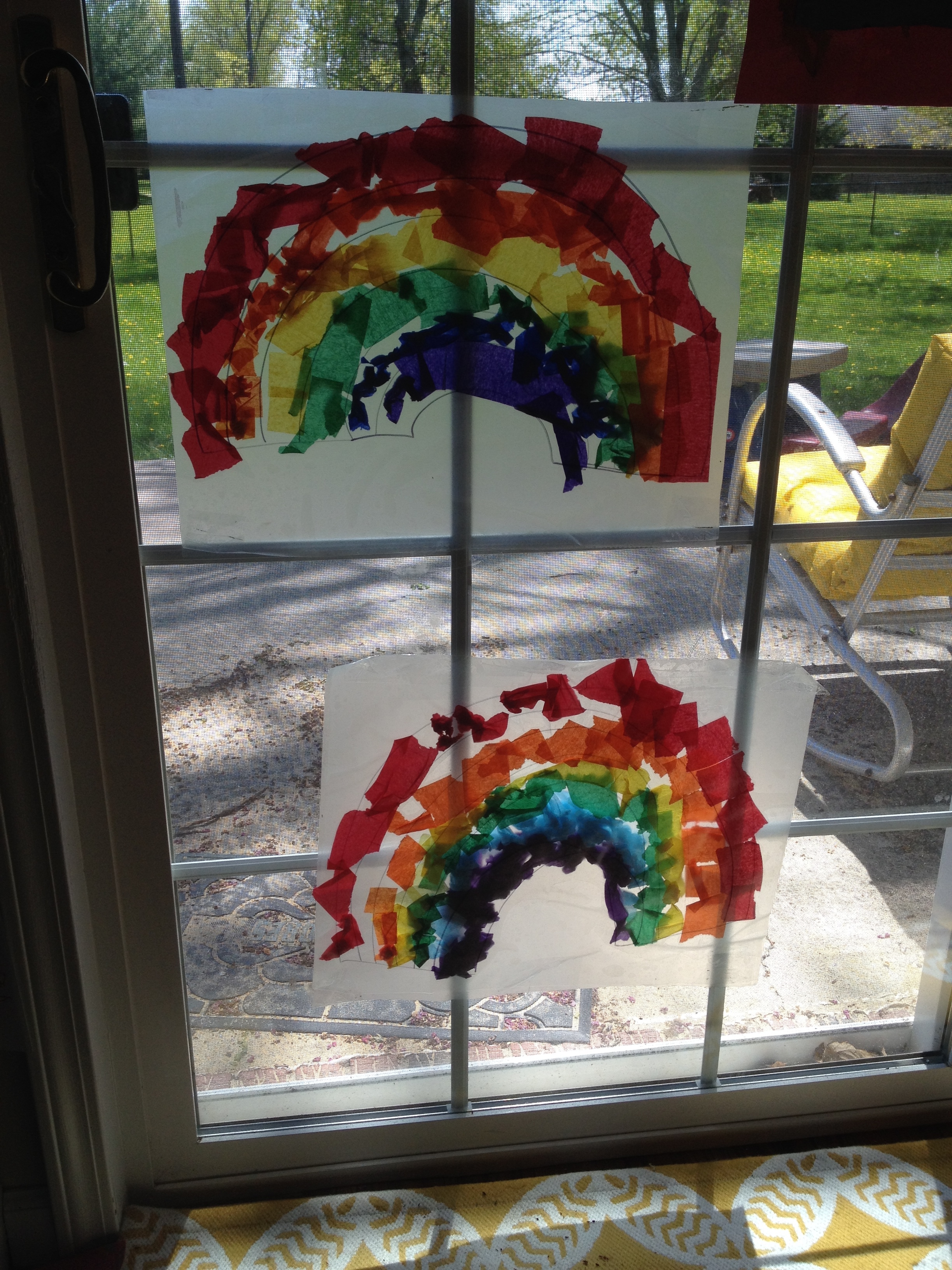 We also made rainbows using 2 pieces of contact paper and some tissue paper.