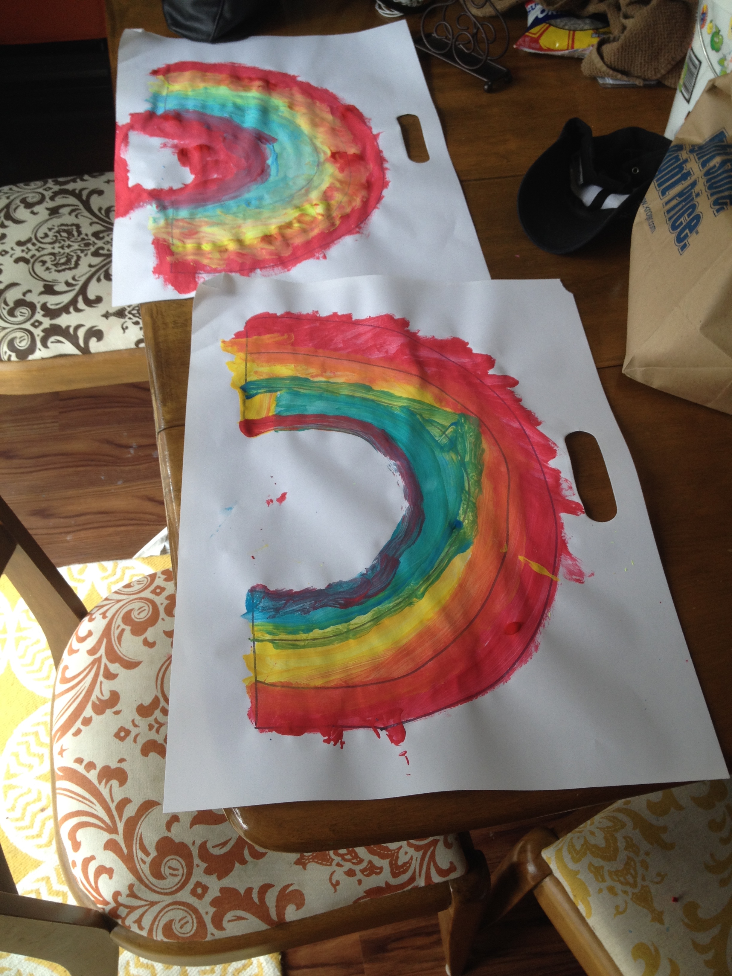 These rainbows were made using only red, yellow and blue paint (so it was a color mixing activity as well.)
