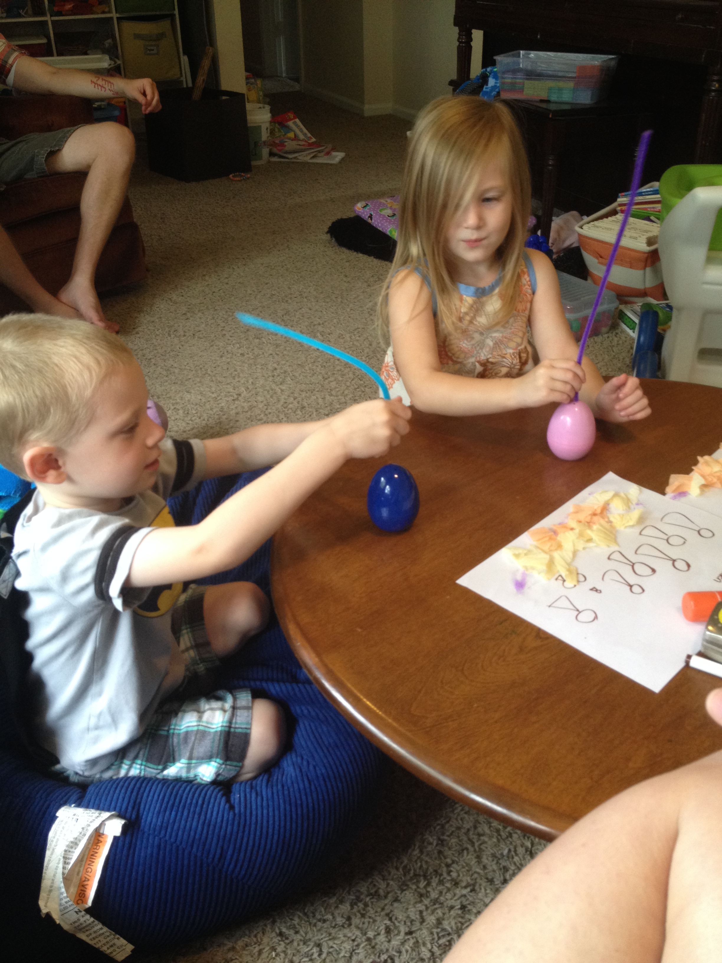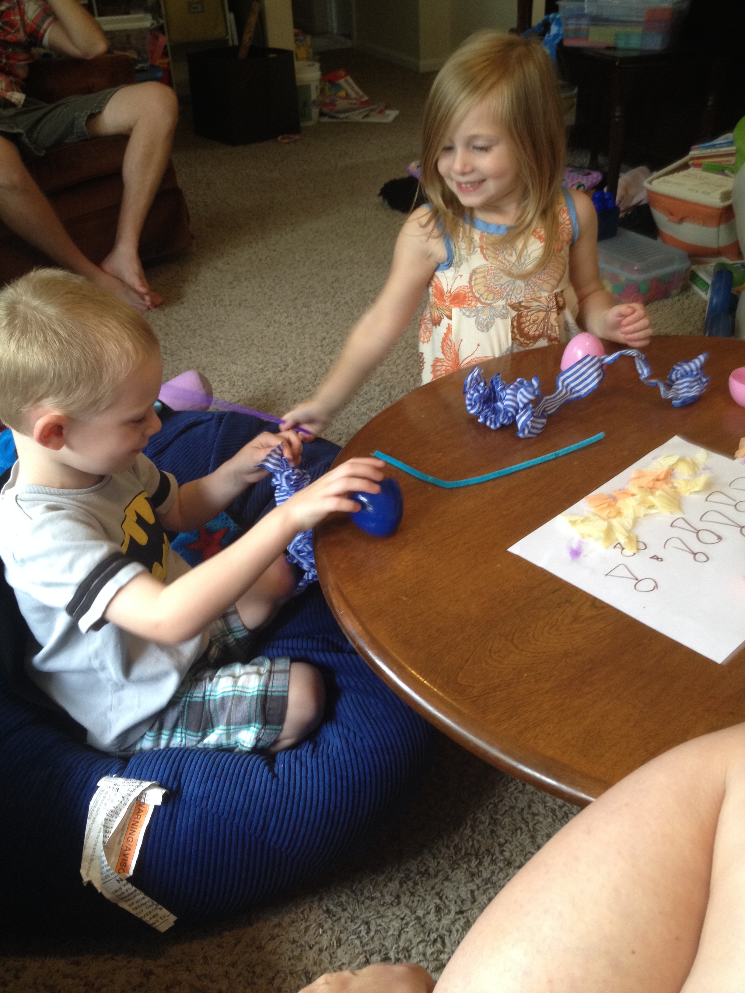 (Above: we used two easter eggs and filled them with blue ribbon, but you could use tissue paper, crepe paper or even actual water if you wanted. Then they used their staffs (pipe cleaners) to tap on the rock, opened them up, and revealed the water.)