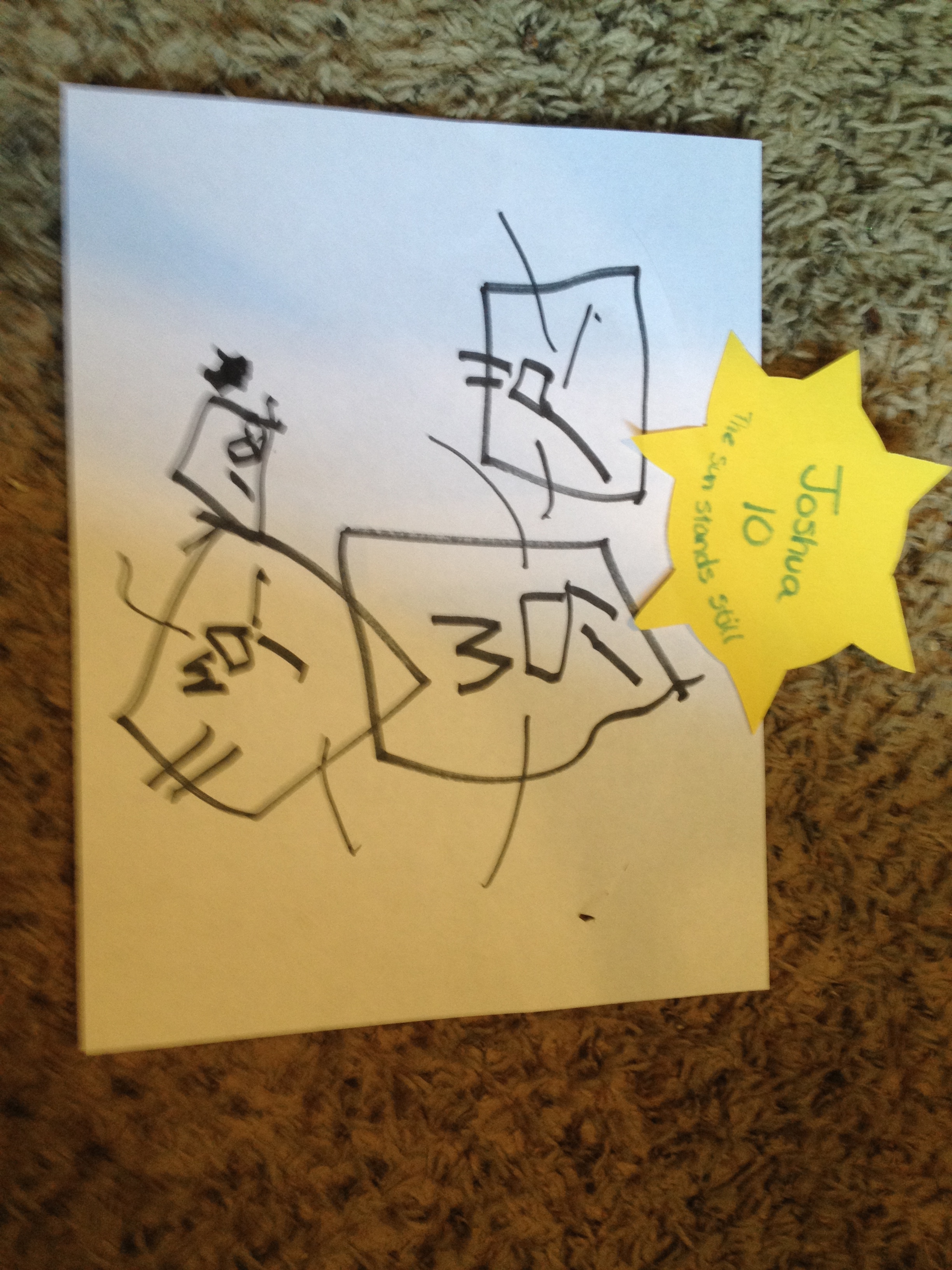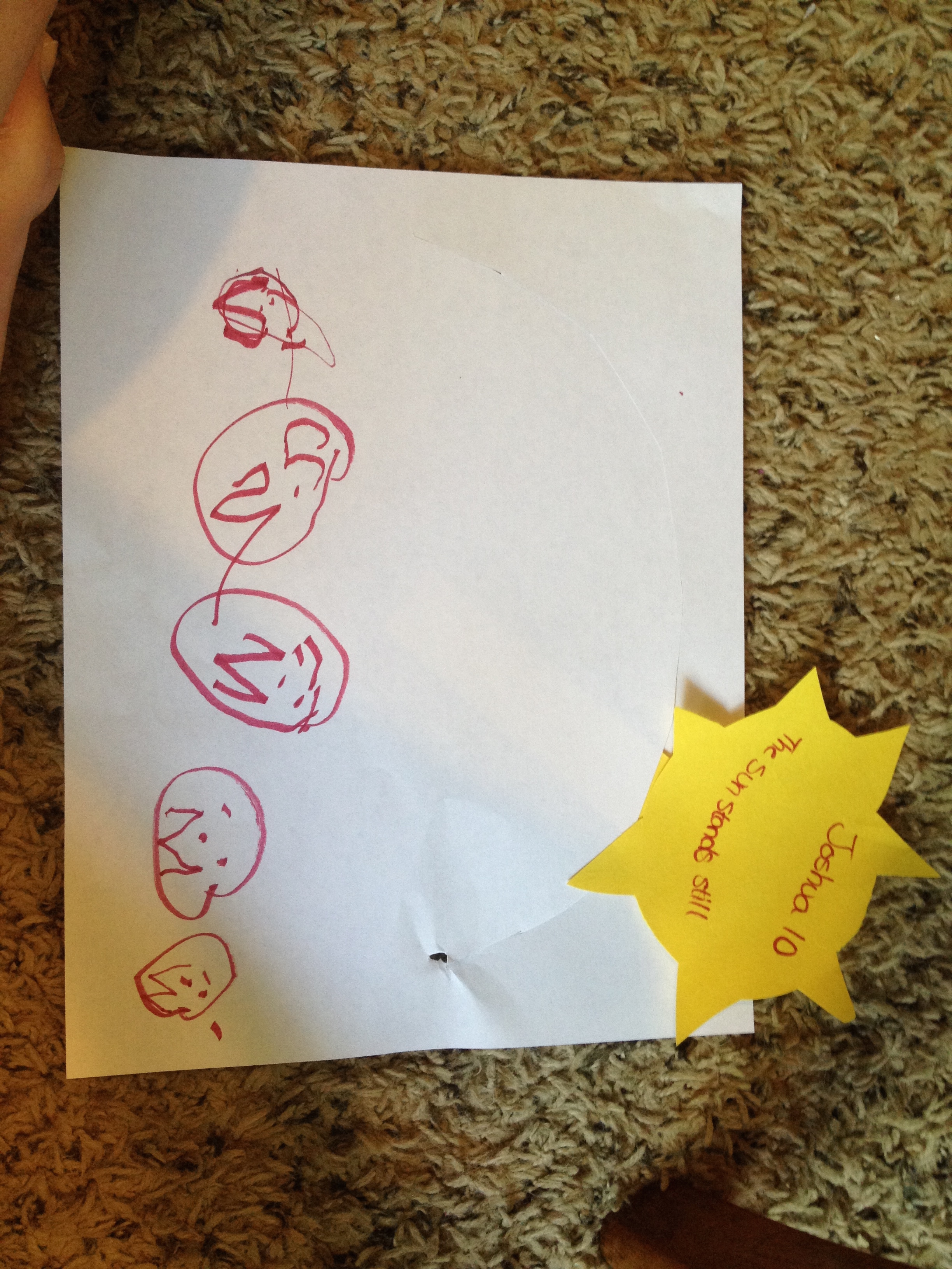 One day they had a big fight, with 5 different kings and their soldiers. The 5 kings all joined together to defeat Joshua, but God said, “Don’t be afraid. I will make sure you win.” So Joshua and the Israelites went ahead and they surprised the kings and other armies. It took a long time to defeat all those guys, so Joshua said, “Sun! Stand still!” (Because you can’t fight in the dark).