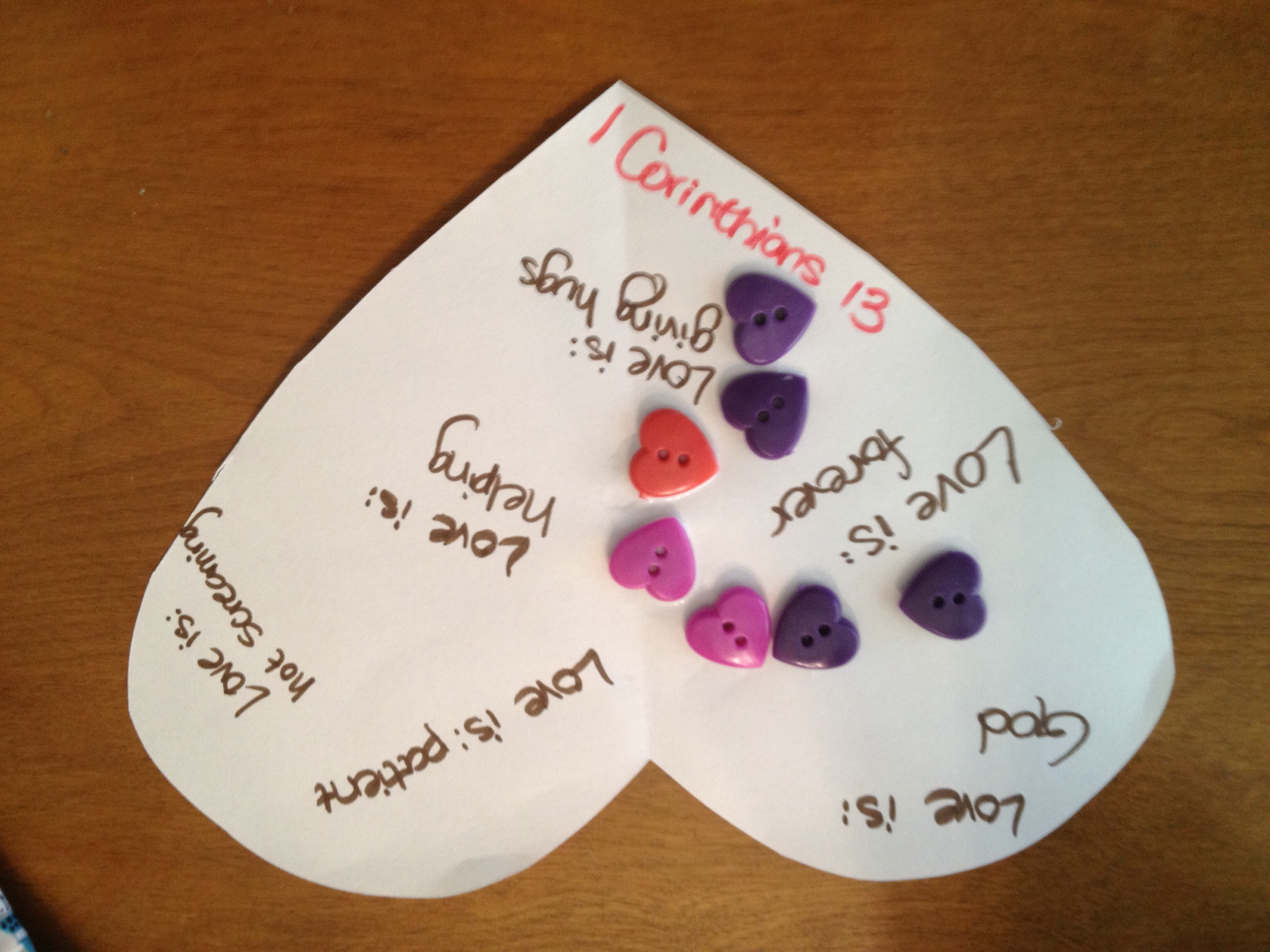 For our craft, we cut out hearts and glued heart type things to them. Then I asked my kids what “love is” and let them answer. (It took *some* examples, but they caught on.) Here are our finished products.
